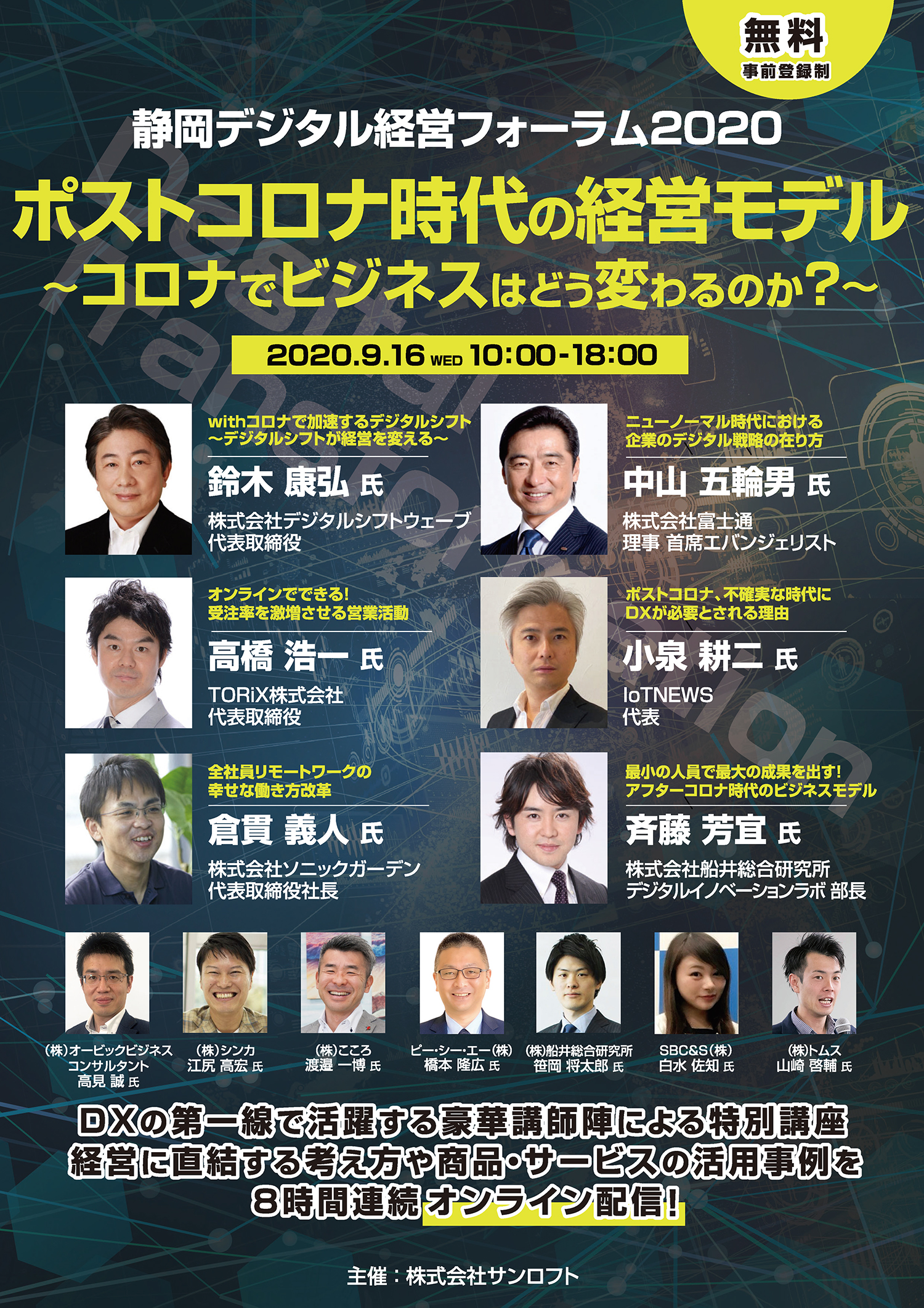 「ポストコロナ時代の経営モデル~コロナでビジネスはどう変わるのか?~」をテーマに、株式会社デジタルシフトウェーブ 代表取締役の鈴木康弘氏、株式会社富士通 理事 首席エバンジェリストの中山五輪男氏、TORiX株式会社 代表取締役の高橋浩一氏、株式会社ソニックガーデン 代表取締役の倉貫義人氏をはじめ、DXの第一線で活躍する専門家16名にご登壇いただきます。