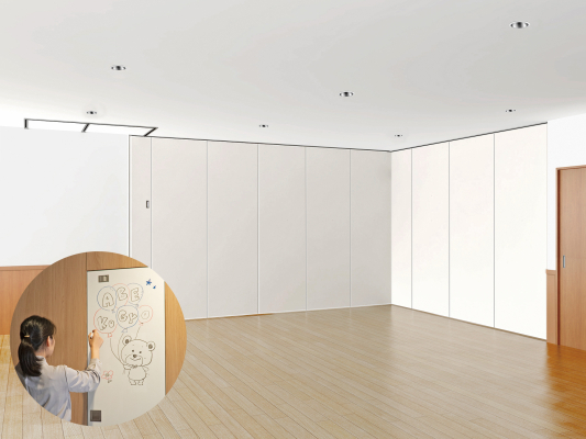 ホワイトボードにはライト・スライディングウォールの特長である軽量化を生かすため、あえてマグネット機能をつけていません。なお、一部の扉に採用することは勿論、扉全面に採用すれば壁面全てがホワイトボードとして使用できます。遊戯室のらく書きや会議室の打合せ用など、様々な使い方が可能です。