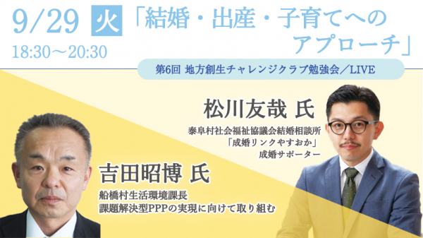 地方でのチャレンジを後押しする地方創生コミュニティ、「地方創生チャレンジクラブ」(運営:G&Cコンサルティング株式会社)は、地方でチャレンジ(移住、起業、事業展開 等)を考える大学生、ビジネスマン、経営者に向けて地方創生オンライン勉強会「結婚・出産・子育てへのアプローチ長野県泰阜村、富山県舟橋村の取組みとは」の募集を2020 年9月1日(火)から開始しています。
