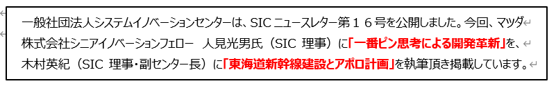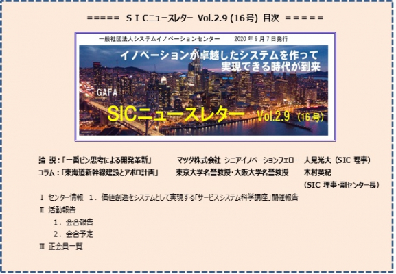 一般社団法人システムイノベーションセンターは、SICニュースレター第16号を,本日公開しました。今回、マツダ 株式会社シニアイノベーションフェロー人見光男氏(SIC 理事)に「一番ピン思考による開発革新」を、木村英紀(SIC 理事・副センター長)に「東海道新幹線建設とアポロ計画」を執筆頂き掲載しています。