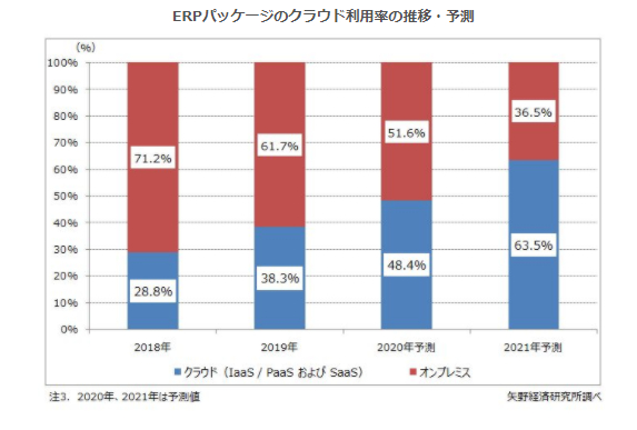 今後のERPの導入においては、クラウド型のERPが優先して選択される傾向が強まる見通しである。2021年にはクラウドの利用率がオンプレミスを上回り、63.5%になると予測する。