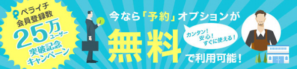 株式会社ペライチ(本社:東京都渋谷区、代表取締役:橋田一秀、以下「ペライチ」)は、ホームページ作成サービス『ペライチ』の会員登録ユーザー数が累計25万人を突破したことを記念し、2020年9月8日(火)~10月30日(金)16:00の期間限定で「25万ユーザー突破記念キャンペーン」を実施いたします。期間内に申し込みをされた方を対象に、『ペライチ』の「予約オプション」を3ヶ月間無償でご提供いたします。