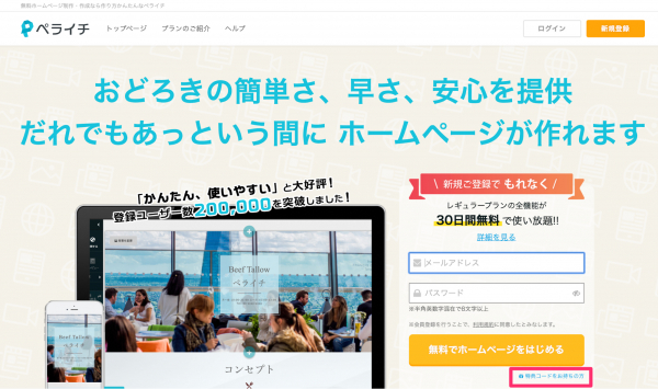 1.『ペライチ』トップページから、「無料でホームページをはじめる」ボタンの下部にある「特典コードをお持ちの方」をクリックしてください。