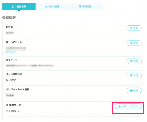 2.ご登録情報ページにて「特典コード入力」をクリックしてください。