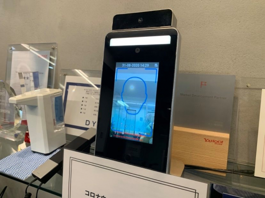 各フロアの出入り口に、衝立式温度計を設置して従業員の入退社時に検温を行なっています。