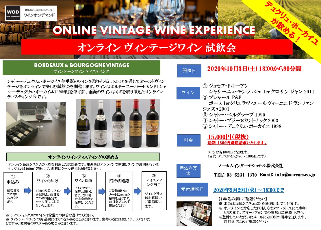 希少ワイン専用のお取り寄せサービス「感動のオールドヴィンテージ!!WODワインオンデマンド」を運営している マーカムインターナショナル株式会社(代表取締役 紙浦 泰宏 本社:東京都港区)は、オンラインでワインティスティングを楽しむ「オンラインZOOMワイン会」を2020年10月3日(土)に開催致します。オールドヴィンテージを楽しむワインテイスティング会です。