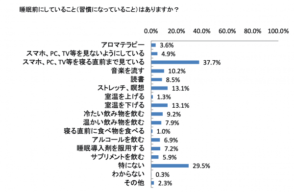 最近の睡眠の質に「あまり満足していない」・「満足していない」人は全体の63%と半数以上の女性が睡眠への不満を抱えており、また睡眠前にしていること(習慣になっていること)で「特にない」人が30% 、また「スマホ、PC、TV等を寝る直前まで見ている人」が38%と、良質な睡眠のために何もしていない人、また良質な睡眠を妨げる行動をとっている人が多いという結果になりました。