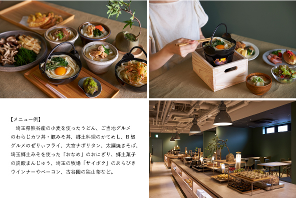 誰もがくつろぎ、楽しめるような公園を感じさせるデザインの朝食会場で、埼玉のB級グルメをはじめ、埼玉県の各地から集まる郷土料理やご当地グルメなど、種類豊富なメニューが集まるマーケットのような朝食をご提供。ホテルのコンセプト「THE PARK」から、お弁当やアウトドアをイメージした器やトレーを用いており、公園のような朝食会場で、お好みの朝食をお楽しみいただけます。