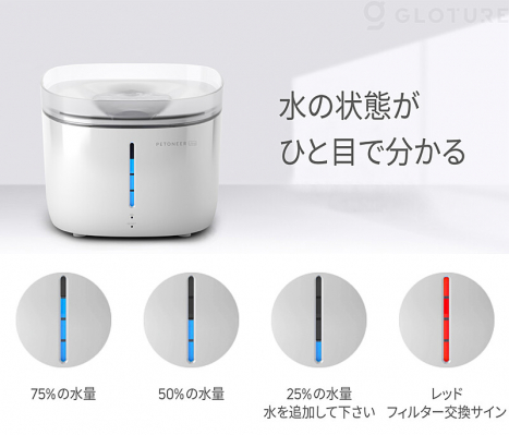 貯水タンク内の水位やフィルターの交換時期を本体正面のLEDインジケーターから確認できます。タンク内の水位をLEDのバーの目盛りで表示。フィルターの交換時期になるとLEDが赤く表示されるので、フィルター交換のタイミングが分かります。