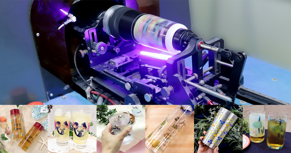 UV光に触れると硬化する樹脂を混ぜたUVインクによるプリント方法を採用、これによりガラス,アクリル,金属,プラスチック,皮革などの素材や,飲料用グラス,ステンレスタンブラー,ワインボトル,化粧品ボトルなどの様々な形状に対応しております。