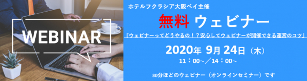 ホテルフクラシア大阪ベイ【https://www.kensyu-center.jp/】 (運営:株式会社マックスパート 東京都千代田区丸の内、代表取締役社長 片山 達哉)は、 “はじめて”オンラインでウェビナーを開催する際のやり方や運営のコツなどお役立ち情報を提供する「無料 オンラインセミナー(ウェビナー)」を開催いたします。