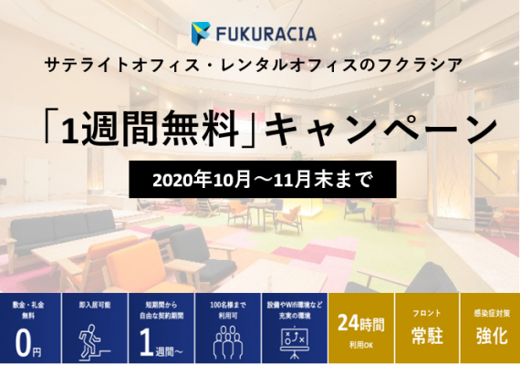 この度対象期間中、フクラシアのサテライトオフィスを「¥0(無料)」でご利用いただけるキャンペーンを実施いたします。