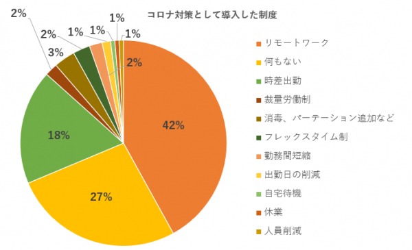 「現職企業ではコロナ対策として、新たな施策を導入(または導入予定)しましたか?」の質問では、「リモートワーク」が42%(63人)でトップ。約7割の企業が時差出勤や勤務時間、出勤日の短縮といった対策を実施した一方で、27%(40人)が「自社では何も対策がなされなかった」と回答しました。