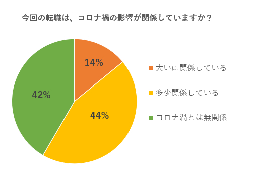 「今回の転職は、コロナ禍の影響が関係していますか?」の質問では58%が影響があったと回答。「他の企業と比較して時差出勤の導入が遅かった。テレワークの導入がされなかった」(28歳男性)、「微熱を訴えている社員でも出勤させる風土があった」(23歳男性)など、会社のコロナ対策への不信感の他「例年の倍以上忙しかったのにも関わらず、給料に一切反映されなかった」(24歳女性)、「人員を削減したことにより、業務負担が増えた」(25歳女性)など、コロナ禍における会社の体制が、中長期的なキャリアプランを見直すきっかけになったという意見もありました。