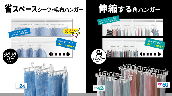一般的な角ハンガーでは干しづらいシーツなどの洗濯物にぴったり合わせたり、洗濯物の量や干す場所にぴったり合わせることのできる、フレキシブルなハンガーをご提案します。従来にない折りたたみ機構で自由に伸縮でき、収納時にもサッと縮められ省スペースなので狭いベランダや、近年増えているランドリールームにも最適です。