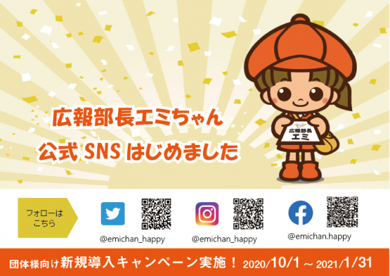 エミちゃんの公式SNS開始を記念して、団体様向け新規導入キャンペーンを開催いたします。
