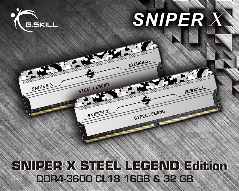 G.SKILL SNIPER X STEEL LEGEND Editionは、ASRockとのコラボレーションにより誕生した、G.Skill Sniper Xシリーズの限定オリジナルメモリです。厳しいテストをクリアした高品質な選別ICチップを使用したSniper Xを、Steel Legendシリーズのマザーボードへ最適化し、更にクロックと安定性を高めています。放熱性に優れたアルミニウムヒートシンクにはSteel Legendシリーズを象徴するブラック&ホワイトのデジタル迷彩を施し、同シリーズのマザーボードと一体感のあるデザインに仕上がっています。16GB(8GB×2)と32GB(16GB×2)の2モデルをラインアップ。
