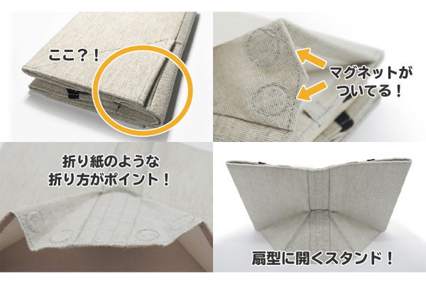 スタンドが自立するしっかりとした生地を採用。しかし肌触りはよく通常のブックカバーとして使用した時に手に馴染みます。また、性別を問わないカラーバリエーションを揃えました。