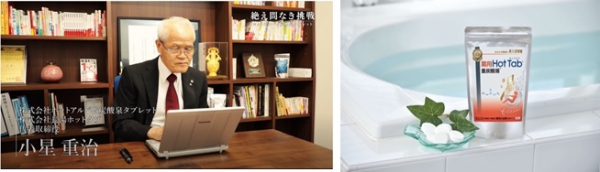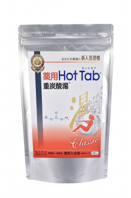 当社は独自の特許技術で開発した重炭酸入浴剤『ホットタブ』シリーズを通じて、人々への健康の普及を積極的に取り組んでいます。『ホットタブ』の錠剤から発生した炭酸ガスは、お湯の中で即座に中性重炭酸イオンに変化し、重炭酸イオンが湯中に豊富に溶けだします。重炭酸イオンは体内のNO(一酸化窒素)を増やして血管を拡張させるため、血流をあげて体温を上昇させ、引いては免疫力を強化することも期待され、健康へのサポートをする入浴剤です。また、一般的な炭酸ガス入浴剤とは異なり、炭酸ガスが発泡をしなくなった状態でも高濃度の重炭酸イオンが湯中に長く留まるため、何度追い焚きをしてもその効果は変わることなく持続される入浴剤です。香料・着色料がゼロ、湯船の残留塩素も中和させるため、肌が敏感な赤ちゃんやホルモンバランスによって肌が変化しやすい女性も安心して入浴することができます。
