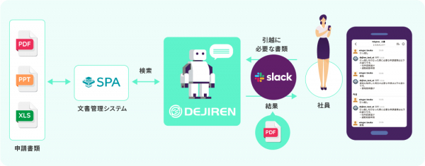 ・人事総務支援: Slack上のDEJIREN Botとのメッセージに必要書類名を入力するだけで、社内ポータルにある人事・総務関連の申請書類を取り出すことができます。ポータルを隅々まで閲覧し目的のドキュメントを探す必要がなくなります。