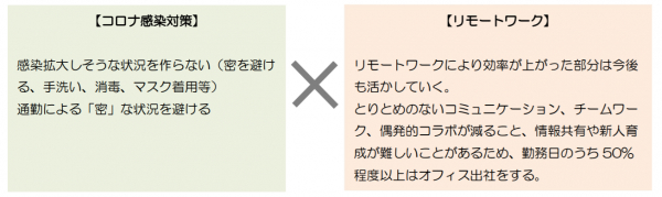 とりとめのないコミュニケーション、チームワーク、偶発的コラボが減ること、情報共有や新人育成が難しいことがあるため、勤務日の内50&程度以上はオフィス出社をする。