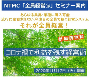 「全員経営」を提唱する経営コンサルティング会社の株式会社NTMC(東京都港区、代表取締役社長 森田 直行)は、ウィズコロナの中においても利益を残すことを願っている経営者を対象に、「全員経営セミナー2020」を 11月17日(火)に開催することになりましたので、お知らせいたします。