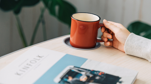 ・デスクにマグカップなどを置けるドリンクホルダー付き