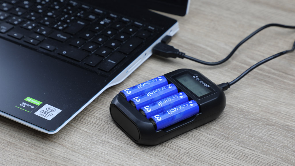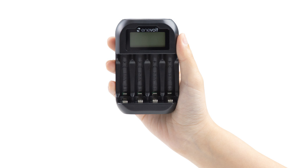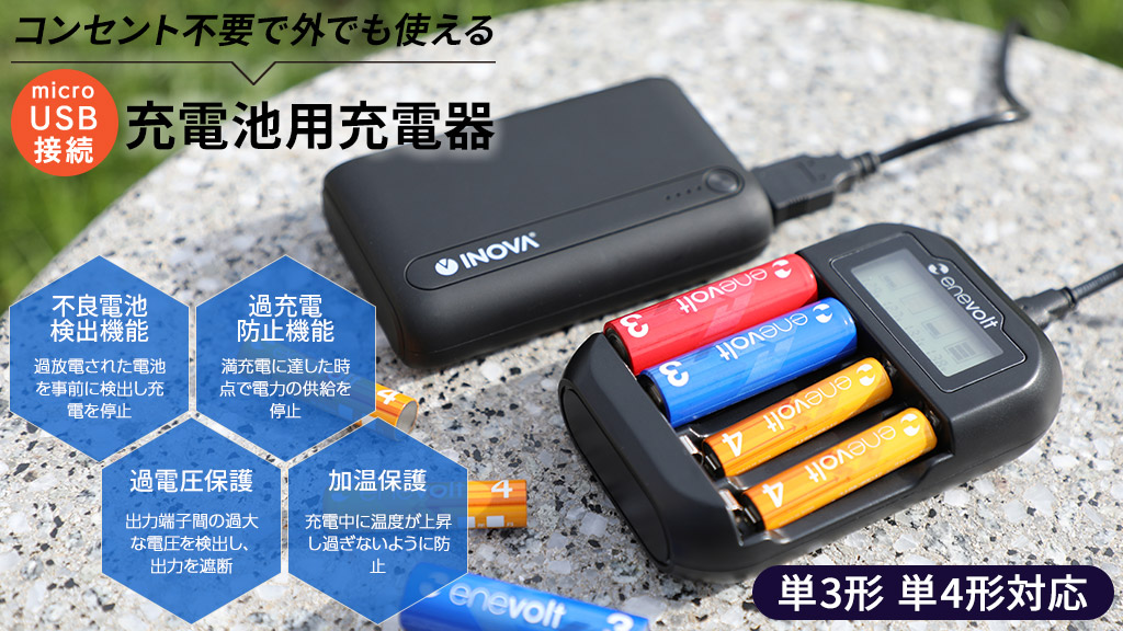 そこで当社は、コンセント不要で屋外、室内問わず充電できる「enevolt エネボルト LCD付 USB充電器 単3 単4 4本用 3R-EVC08BK」を開発しました。
