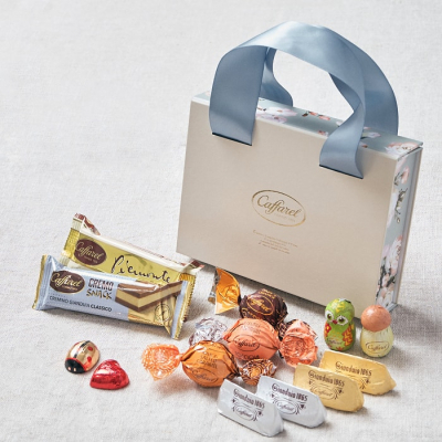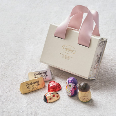 温かみのあるピンクベージュをベースカラーにした花柄ボックスに、同系色のリッチなサテンリボンを持ち手にした、バッグ型の小さなギフトボックスです。カファレルの看板商品「ジャンドゥーヤ」はもちろん、ラッキーアイテムのきのこ、フクロウ、てんとう虫、そして真っ赤なハートのカラフルなホイルチョコレートの全6粒が入っています。ちょっとした気持ちを伝えるギフトに最適です。
