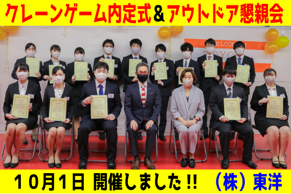 日本経済新聞社主催の中小企業 魂の声~2030年に残したい企業~ 約100社に選ばれた、「笑顔創造」を 企業理念とする、設置台数が日本最大級のクレーンゲーム専門店「エブリデイ」や埼玉県内売りたいショップNO.1獲得(※2016年インターネットリサーチ調べ)のブランド品や貴金属、宝石等のリサイクル買取販売店「エブリデイゴールドラッシュ」などを運営する株式会社東洋(埼玉県北本市 代表取締役:中村秀夫/以下、当社 )は2020年10月1日(木)に、当社の運営する店舗のエブリデイとってき屋 東京本店(埼玉県八潮市)にて、クレーンゲーム内定式&アウトドア懇親会を開催致しました。