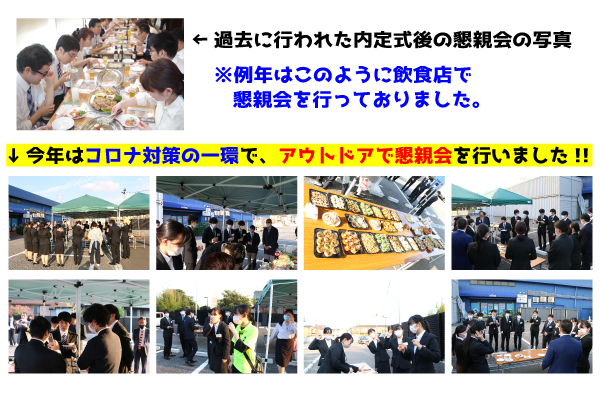 また、例年では内定式後に飲食店にて、懇親会を開催しておりましたが、今年はコロナ対策の一環として、飲食店では行わず、「3密」を気にせず安心して親交を深められる様に、店舗の駐車場にテントを張り、アウトドアで懇親会を行いました。