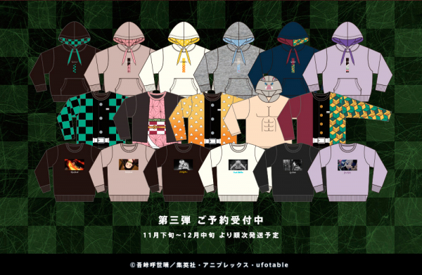 続けて第三弾としては、第一弾で非常に人気の高かったキッズアイテムの商品ラインナップを大幅拡充しております。大人と同デザインのプルオーバーパーカーに加え、一枚でキャラクターになりきれるデザインのトレーナー、シンプルなキャラクターのプリントトレーナー等、バリエーション豊富に取り揃えております。加えて第一弾でも人気の高かった、大人サイズのプルオーバーパーカーも追加生産しております。