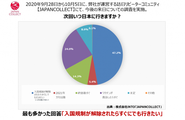 日本の「旅」と「食」のマーケティングを手がける株式会社iNTO(イントゥ 本社:東京都港区 代表取締役:小松﨑友子) は、訪日リピーターで構成されたオンラインコミュニティ「JAPANCOLLECT(ジャパンコレクト)」で今後の訪日意向についての調査を実施した。