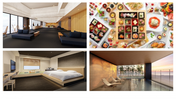 地上11階で前面180度のパノラマ風景が楽しめるガラス張りのフロント、10階には外の景色を楽しみながらリラックスできる大浴場や貸切風呂がございます。