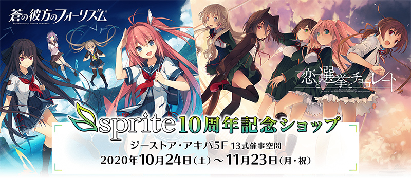 全国6店舗(秋葉原・仙台・大阪・大阪ANNEX・名古屋・小倉)展開中のキャラクター・ライフスタイル・ストア「ジーストア」の運営などを手掛ける「タブリエ・マーケティング株式会社」は、大人気ゲーム『恋と選挙とチョコレート』『蒼の彼方のフォーリズム』を制作したゲームメーカー『sprite』の10周年を記念した『sprite10周年記念ショップ』を、2020年10月24日(土)~11月23日(月・祝)までジーストア・アキバ5F 13式催事空間で開催することを発表した。