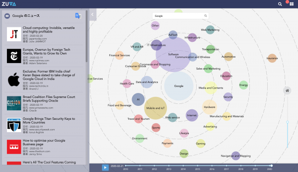 「ZUVA」は、世界100万社のスタートアップをデータベース化し「GAFA(※)がどういった分野に注力しているか」「ライバル会社がどのような分野に注力しているか」「自社が注力している分野にどういったスタートアップが活動しているか」等、知りたい情報を色々なストーリーで、素早く、安価で、的確に「新規事業のネタ」となる「ユニークな技術サービスを提供する世界のスタートアップを見つける」ことが出来るプラットフォームです。更に、米国、中国との強いネットワークを通し「日本に進出したい」「日本の企業と提携したい」と考える有力スタートアップを揃え「海外スタートアップとすぐに協業し新規事業創造に動き出せる」のもZUVAのプラットフォームの特徴です。