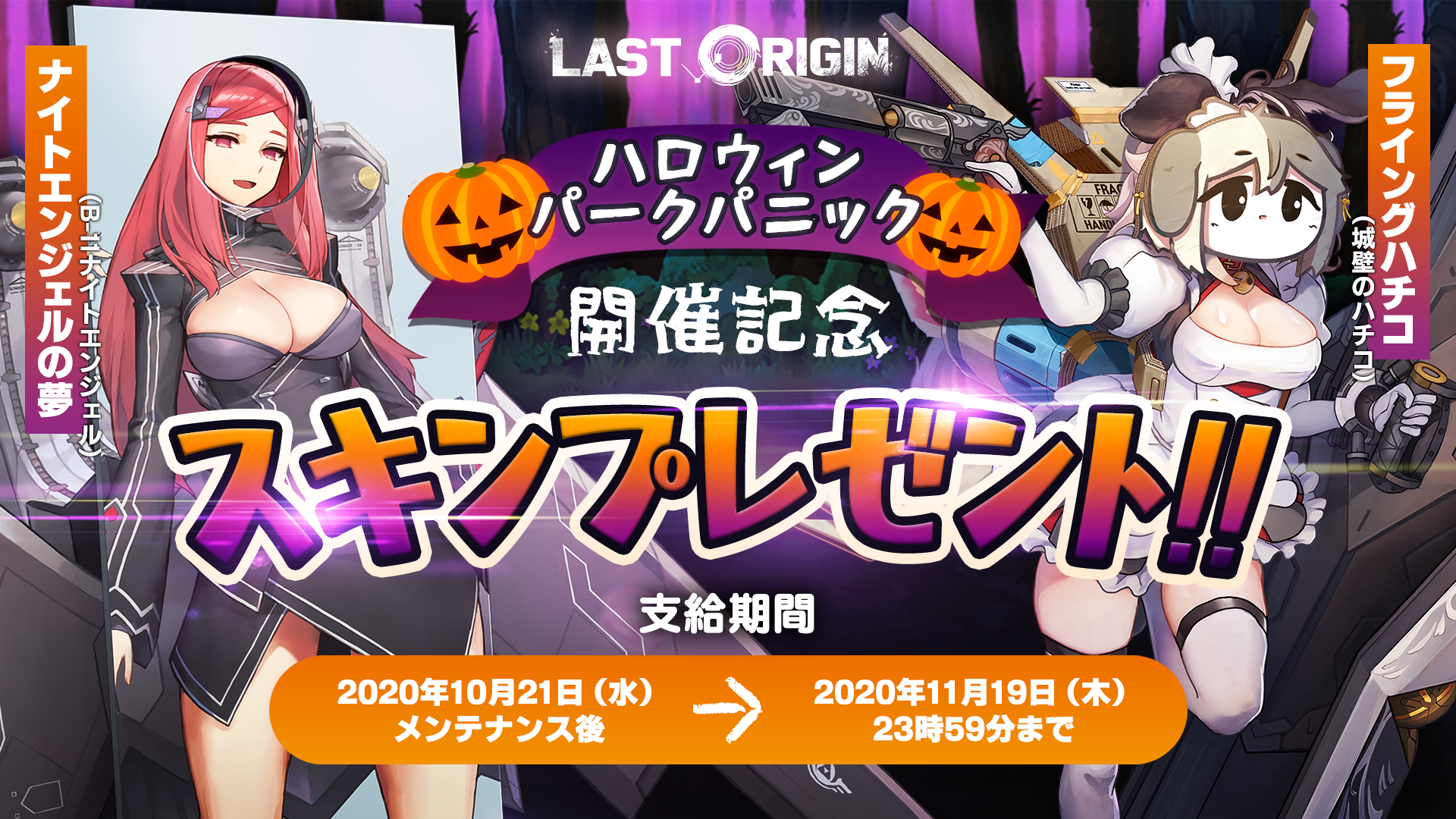 イベント「ハロウィンパークパニック!」の開催を記念して、全司令官にスキン「ナイトエンジェルの夢(B-11ナイトエンジェル)」および「フライングハチコ(城壁のハチコ)」をプレゼントいたします。