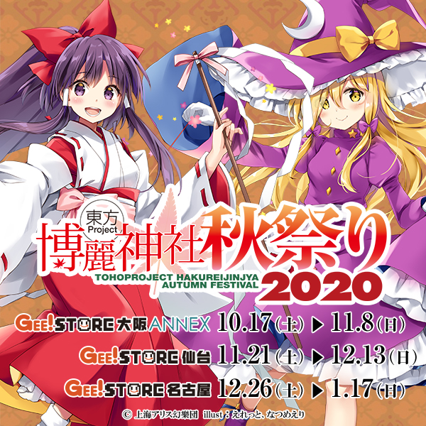 全国6店舗(秋葉原・仙台・大阪・大阪ANNEX・名古屋・小倉)展開中のキャラクター・ライフスタイル・ストア「ジーストア」の運営などを手掛ける「タブリエ・マーケティング株式会社」は、ジーストアにて「東方Project×ジーストア『博麗神社~秋祭り2020』」を、順次開催することを発表。