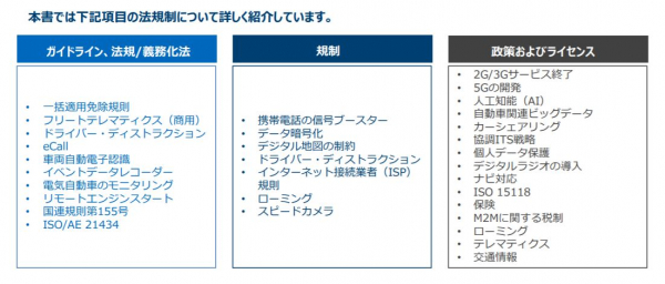政府の法規制により、コネクテッドカー戦略の開発および導入に影響を及ぼす技術の数は増加しています。自動車、電気通信、治安、データプライバシー、データ保護、環境保護、税金に関する法律など、かつては分離していた各分野の法規制が現在では1つにまとまりつつあり、様々な法規制がコネクテッドカー技術に影響を及ぼす可能性があります。昨今では、地方自治体、州や省、国、地域レベルで車両コネクティビティを推進もしくは制約する義務化法、規制、法律、ライセンス、あるいはガイドラインを導入する国々が増えてきています。