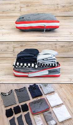 旅行のワクワク感からインスパイアされた4種類のデザイン。服を入れる部分と圧縮する部分のジッパーの色を変え、見分けやすいようになっています。