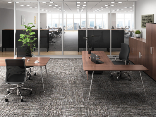 グレードは、「ハイグレードタイプ」と「スタンダードタイプ」の2種類。製品ラインアップは、メインアイテムのデスク、L型デスクに加え、両開き収納庫、ワードローブ、サイドキャビネットがあり、デスクはオプションで幕板、デスクトップパネルと組み合わせることも可能です。また、カンファレンステーブル「INTEO(インテオ)」とコーディネートしてお使いいただけます。