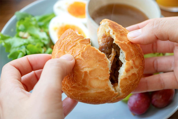 4種の国産きのこ(ひらたけ、まいたけ、エリンギ、ぶなしめじ)と牛肉のコクと旨味が凝縮された贅沢なブラウンシチューを、自家製酵母入りのシンプルでもっちりとしたパンに詰めて焼き上げました。トラの毛皮のような模様は「ダッチロール」といい、上新粉に少量の砂糖、塩、イーストを混ぜ、水を入れて撹拌し発酵させたあと、パン生地に塗り、焼き上げることで模様ができ、かりっとした食感を生み出します。もちもちとしたフランスパンと表面のカリカリ感、2つの食感と、中から出る熱々シチューが絶品です。具沢山なのでサラダや飲み物と合わせるだけで満足感たっぷり。