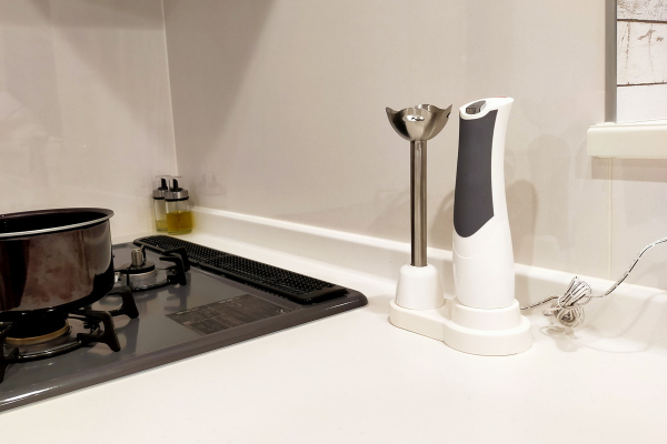多機能で便利なハンドブレンダーですが、市場のほとんどがコード付きの製品であり、ハンドブレンダーの小回りが利く利便性に反してコンセントの近くでしか使用できないという不便さがありました。鍋の中で直接調理したり、アタッチメントを変えて野菜のみじん切りやホイップクリームなどの泡立てにも使用できるなど、ミキサーやその他置き型調理家電にはない小回りの利いた製品性能を最大限生かすため、充電式コードレスタイプのハンドブレンダーを可能な限り低価格で市場に出したいと考えたことから、当製品を企画いたしました。
