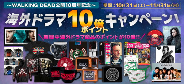 日本最大のRock & Entertainment公式Tシャツ・グッズ・ストア【PGS】を運営する株式会社JAMSHOPPING(本社:東京都渋谷区代表取締役:遠藤祐一)は、今年10月30日に人気海外ドラマ「WALKING DEAD」が放送から10年を迎えた記念として、取扱い海外ドラマ公式商品をお買い上げいただくと10倍ポイント・バックのキャンペーンを実施中!