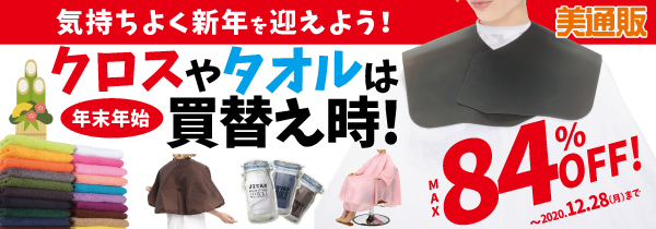 そこで、美通販では年末年始に向け、クロス類・タオル類を最大84%OFFでお買い求めいただけるキャンペーンを実施いたします。人気の売れ筋クロス・タオル、タオル関連機材の他、注目の新商品もご用意しております。この機会にクロスやタオルを一新して気持ちよく2021年を迎え、顧客満足度アップ・売上の向上にお役立ていただきたい次第です。キャンペーン期間は2020年12月28日(月)まで。
