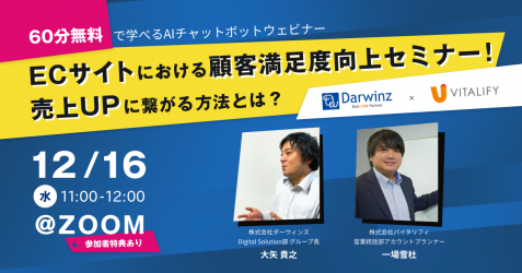 バイタリフィ(本社:東京都渋谷区、代表取締役:川勝潤治)とダーウィンズ(本社:東京都千代田区、代表取締役社長:後藤豪)は、12 月16日(水)に無料ウェビナー『ECサイトにおける顧客満足度向上セミナー!売上UPに繋がる方法とは?~<無料>60分で学べるAIチャットボットウェビナー~』を開催致します。