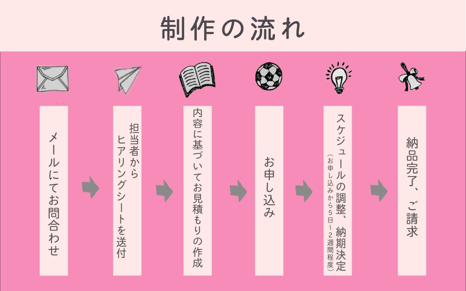 まずは当社サービスページよりお問い合わせください。別途担当より詳細についてお伺いするためのヒアリングシートをご送付させていただき、記載いただいた内容を確認した上で、お見積りを作成いたします。正式にお申し込みをいただきましたら、スケジュールの調整を行い、実際の制作を進めてまいります。