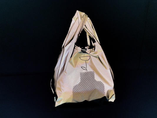 エコバッグの最大の特徴である素材には、ポリウレタン生地にリフレクター加工を使用しています。スマートフォンのフラッシュ撮影により、まるでバッグ自体が光を発したような映りとなり、SNSで独自の投稿ができるなど見る者を楽しませてくれる商品となっています。