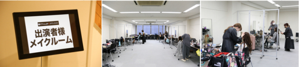 90平米の会場に4つのメイクブースを設置し、広めに利用する事で密の回避。さらに、各ブースの間に3つ折りのパーテーションタイプのアクリルパネルを手配・設置し飛沫感染予防対策をとりました。