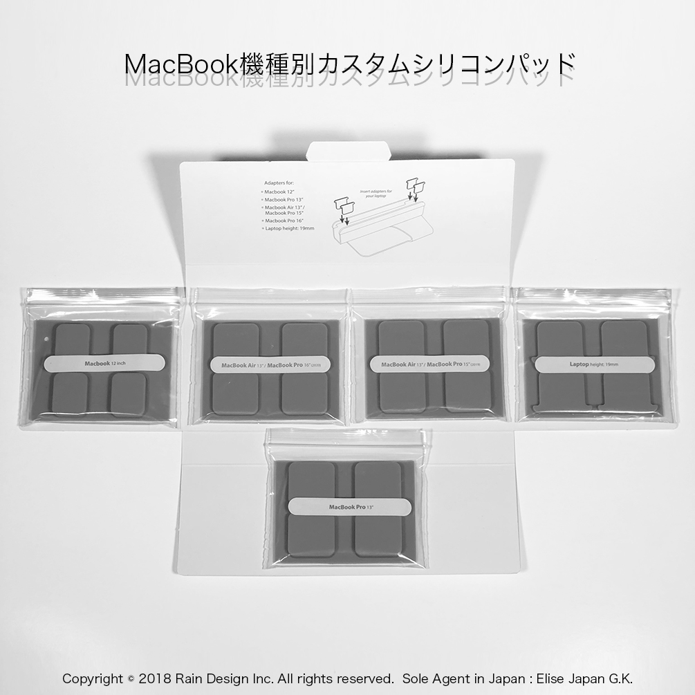 * ネジや留め金を不使用、ガタつきが全くない抜群の安定感|MacBook(ノートPC)のサイズに合わせ、5種類のシリコンパッドが付属(16インチから11インチ)